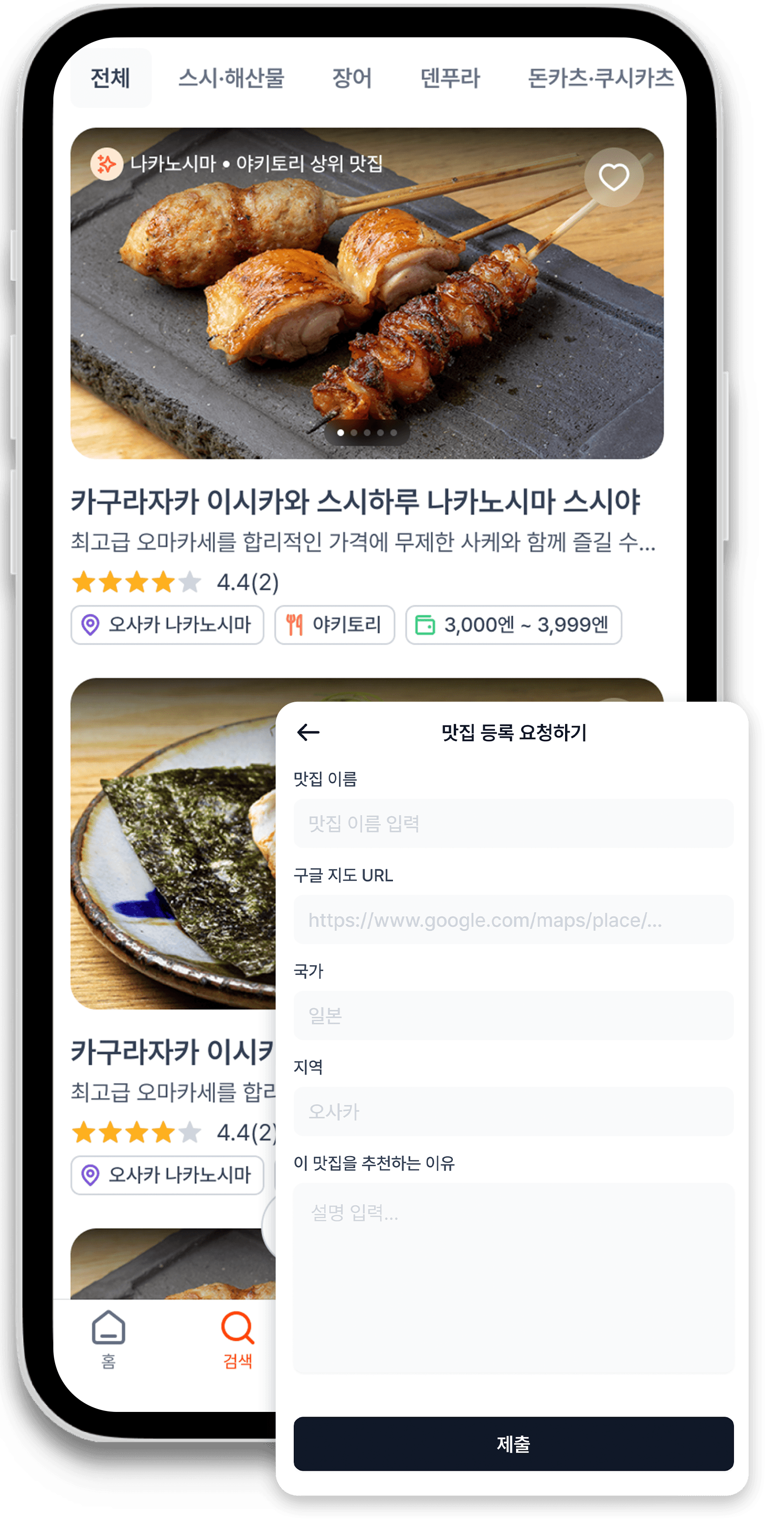 일본 전역의 맛집을 한 곳에서 만나보세요. 스시, 라멘, 야키니쿠부터 미슐랭 레스토랑까지 5천개 이상의 맛집들을 모아놓았어요.